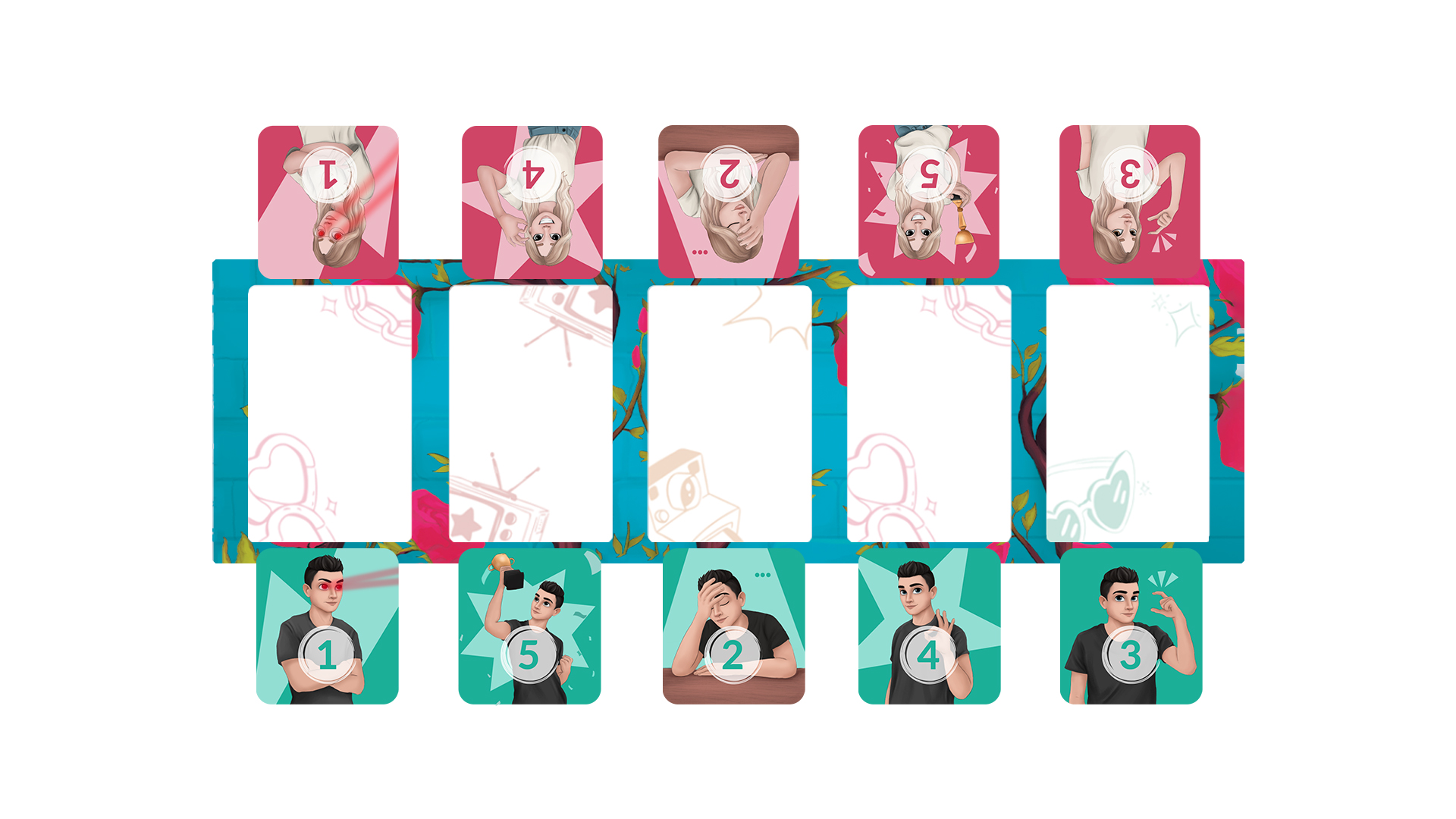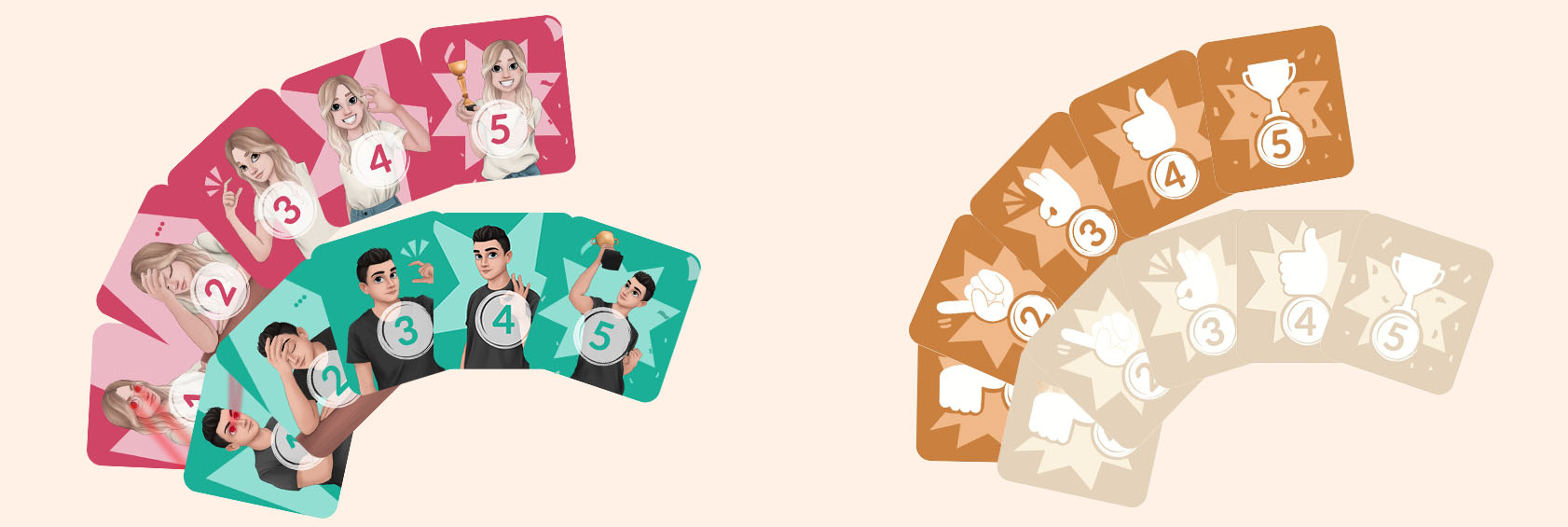 • 150 kart podpowiedzi – 10 kategorii; po 15 kart na kategorię • 72 karty wyzwań w pakiecie podstawowym – 6 kategorija; 6 kategorii; po 12 kart na kategorię: - Zabawne wyzwania - Kultura popularna - Życie domowe - Wyzwania fizyczne - Mężczyźni przeciwko kobietom - Jak dobrze mnie znasz?